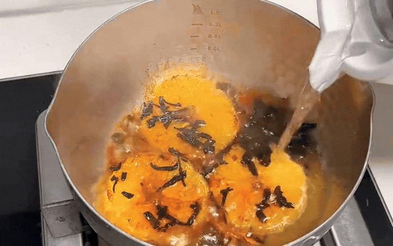 Khi cam đã dậy mùi, thêm một ít nước sôi vào nồi, đun cho hỗn hợp sôi trở lại. Phần nước này sẽ kéo theo tinh chất trà và hương cam hòa quyện với nhau. Sau đó, cho vào một hộp sữa tươi. Chỉ cần chờ sữa vừa sôi lăn tăn là tắt bếp ngay để tránh sữa bị tách nước.