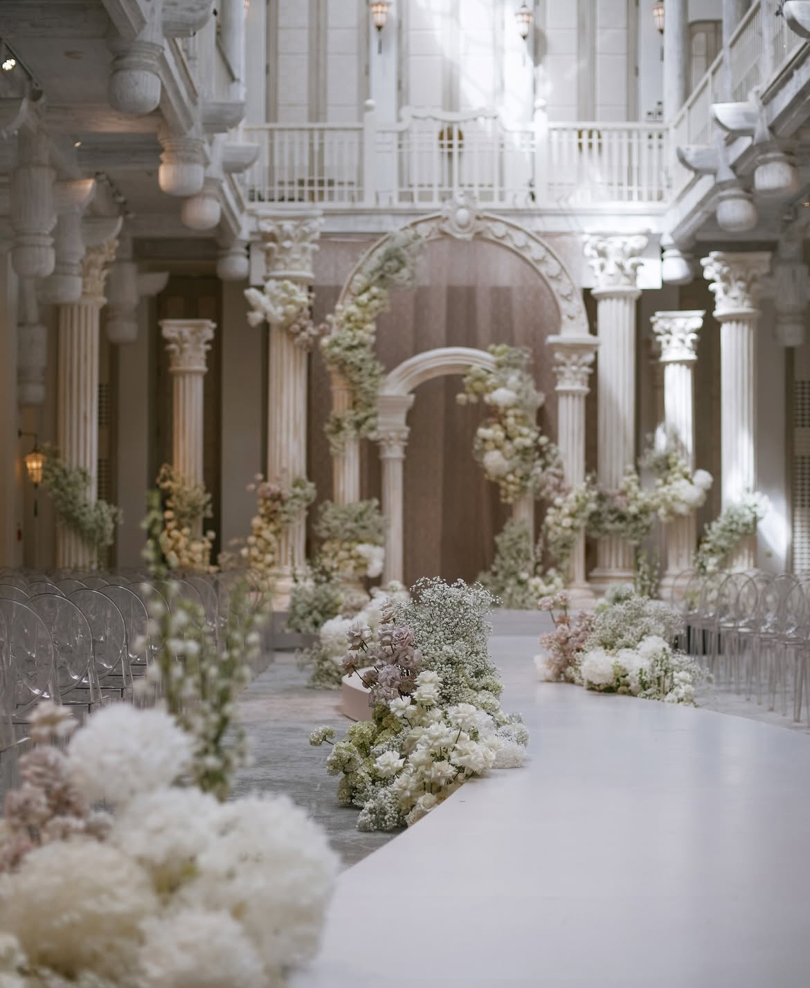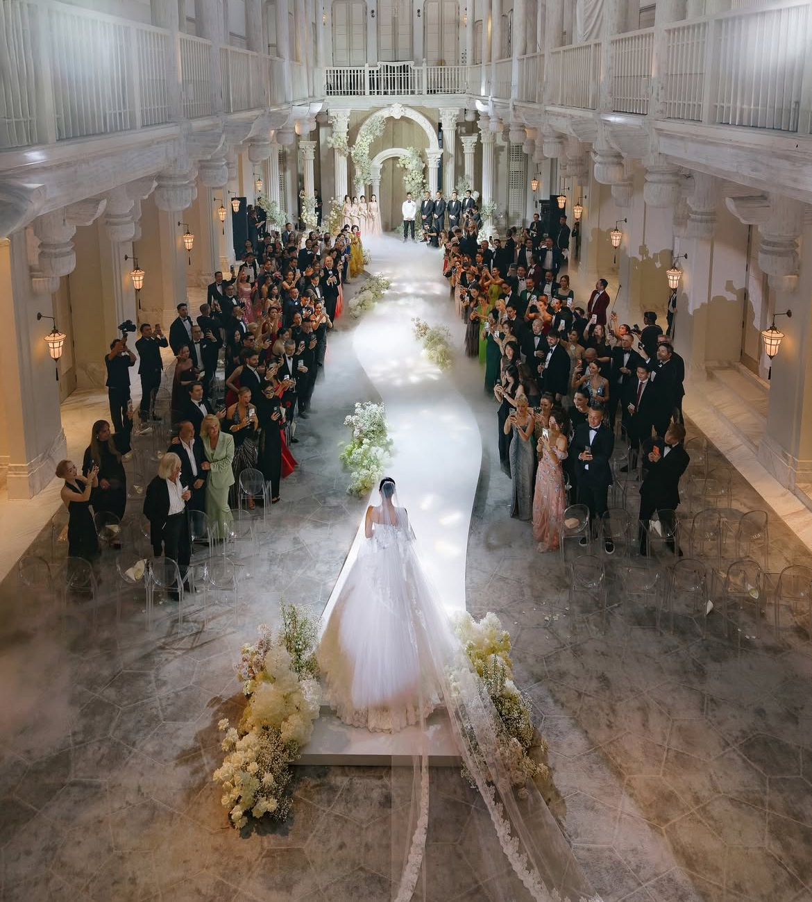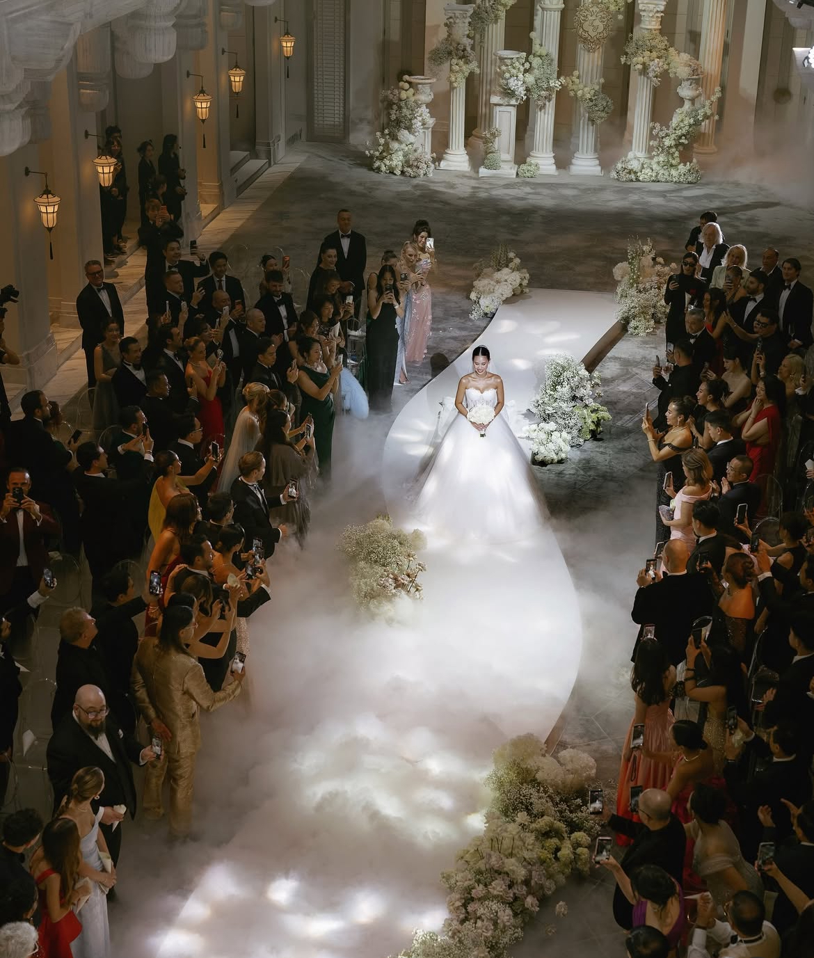 Theo những hình ảnh được chia sẻ, không gian cưới được trang trí hoàn toàn bằng hoa tươi theo phong cách Phục hưng, lấy tông trắng làm chủ đạo. Tổng thể mang lại cảm giác xa hoa, sang trọng nhưng vẫn giữ được sự ấm cúng, đúng tinh thần của một lễ cưới riêng tư hơn so với hôn lễ đầu tiên.