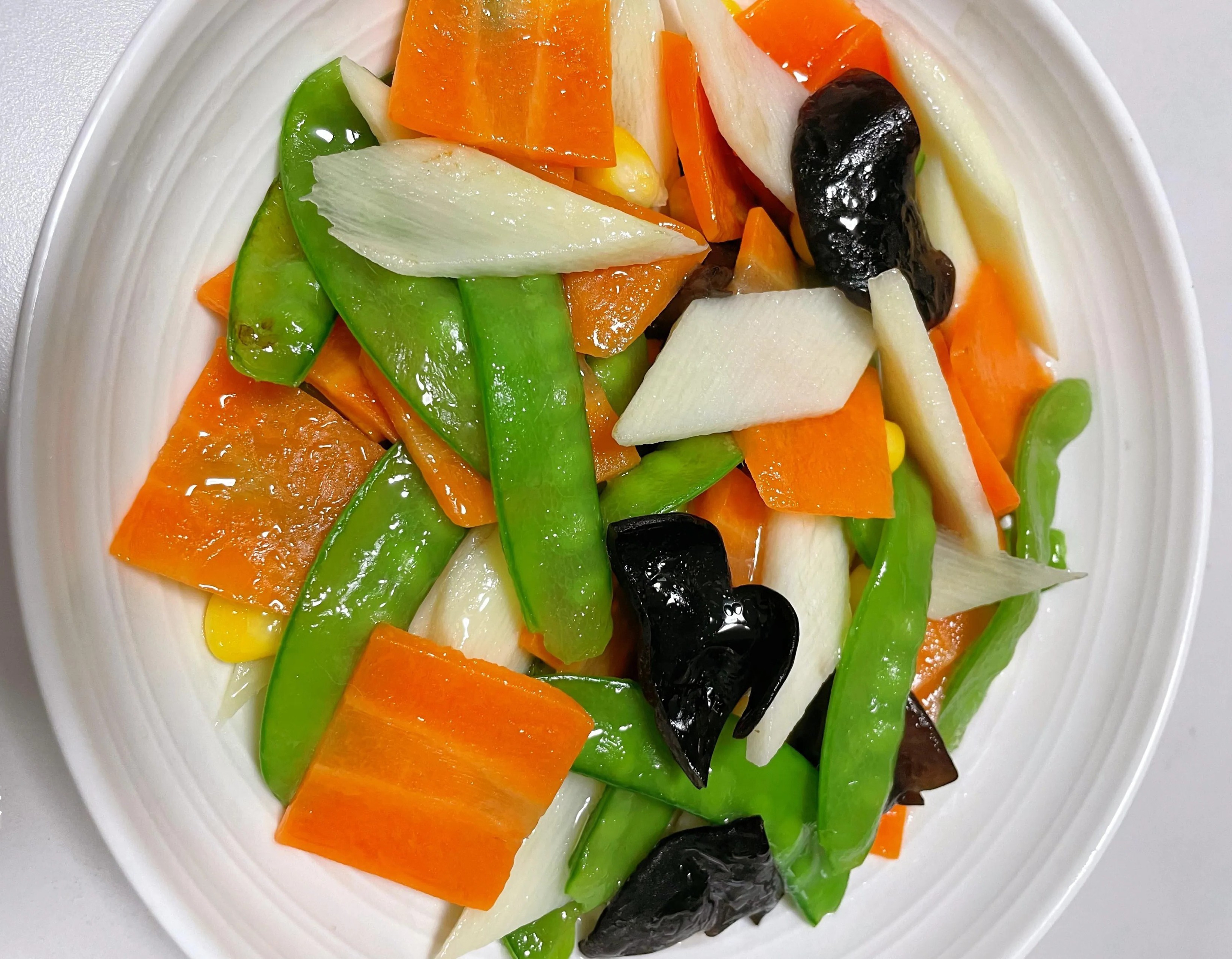 Nguyên liệu: 200g củ mài (gọt vỏ và thái miếng mỏng), 200g đậu Hà Lan, 1/2 củ cà rốt, một ít hạt ngô ngọt, 2 cây mộc nhĩ ngâm mềm rồi xé nhỏ, một chút muối, hạt nêm vị gà, 1 thìa canh bột bắp.