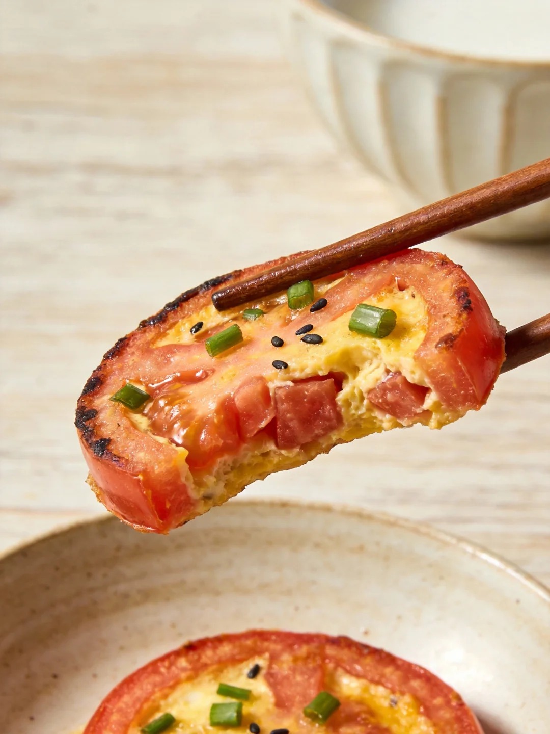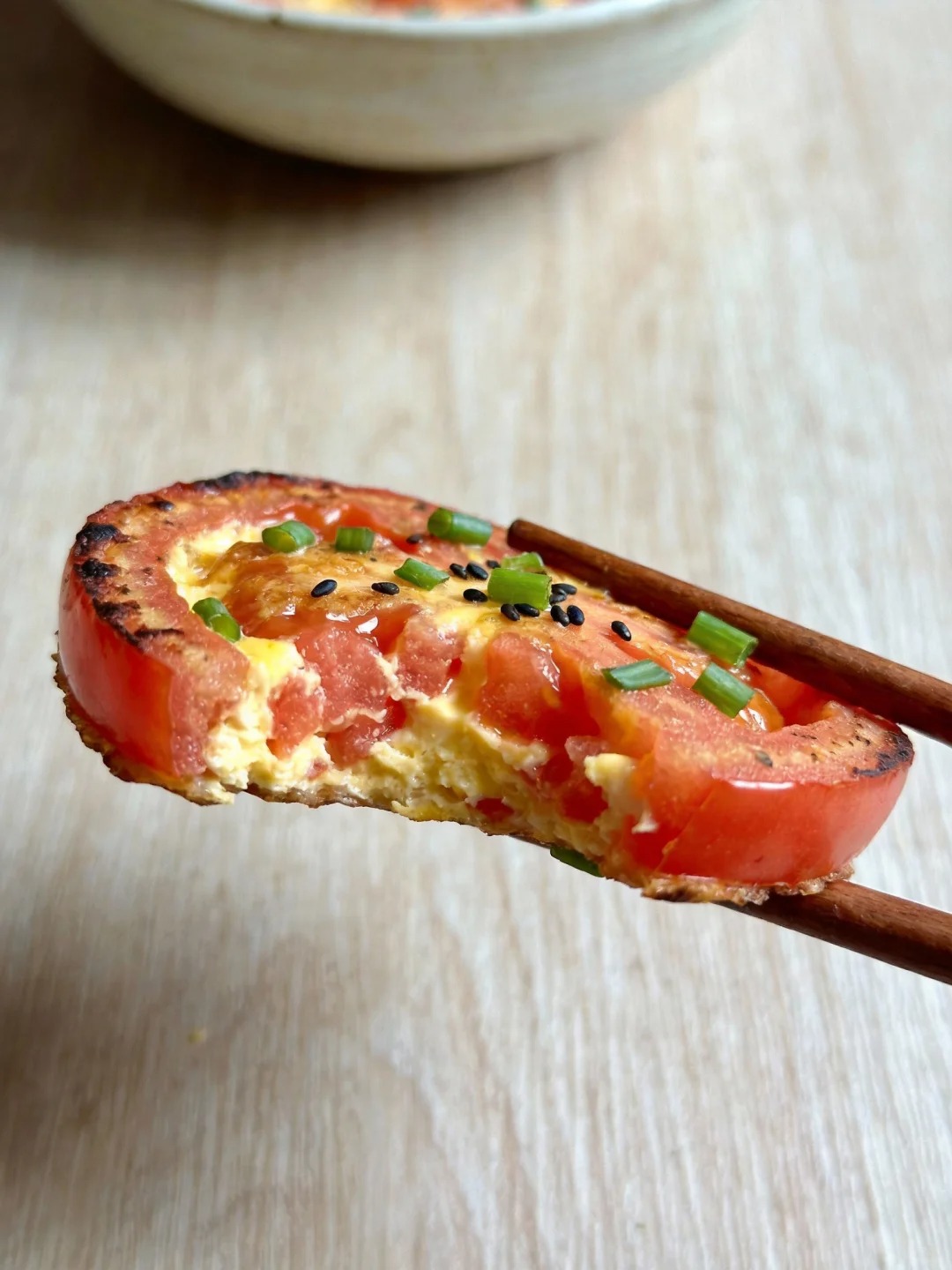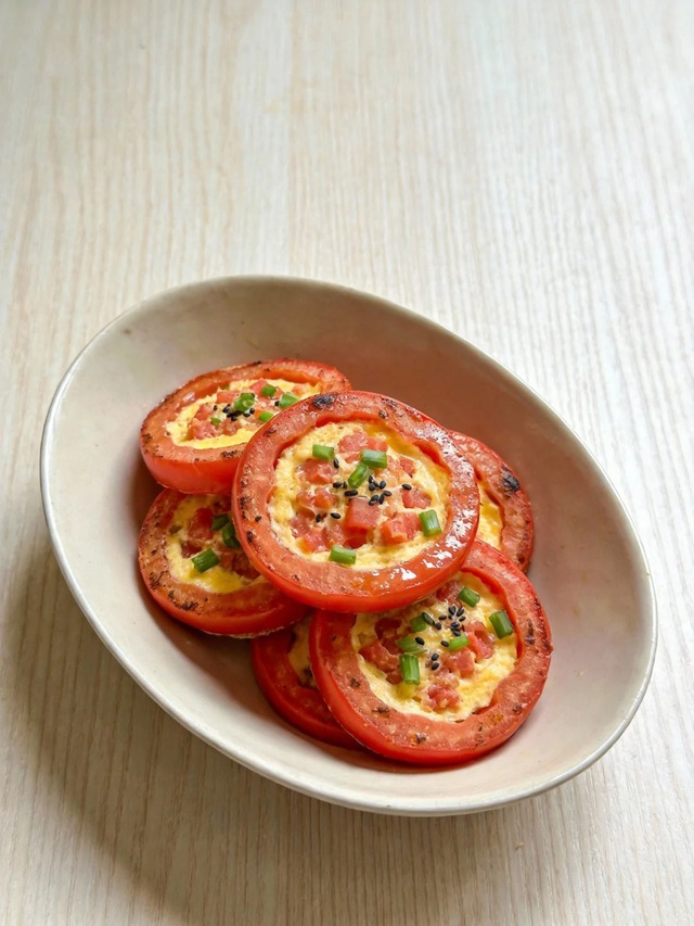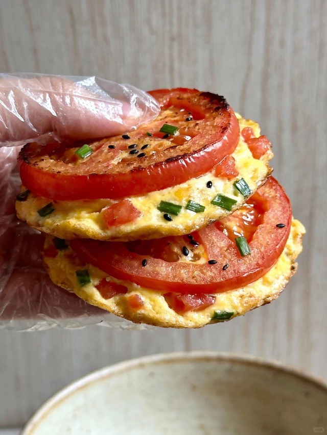 Cảm giác khi chiếc bánh vừa chín tới, phần trứng vàng óng nằm gọn trong khoanh cà chua đỏ tươi, rắc thêm chút mè đen hoặc hành lá xanh mướt lên trên, nhìn thôi đã thấy vui mắt. Cắn một miếng, vị chua nhẹ của cà chua quyện với độ béo vừa phải của trứng, thêm chút ngọt tự nhiên, tất cả hòa vào nhau khiến người đang ăn kiêng cũng phải thốt lên vì bất ngờ.