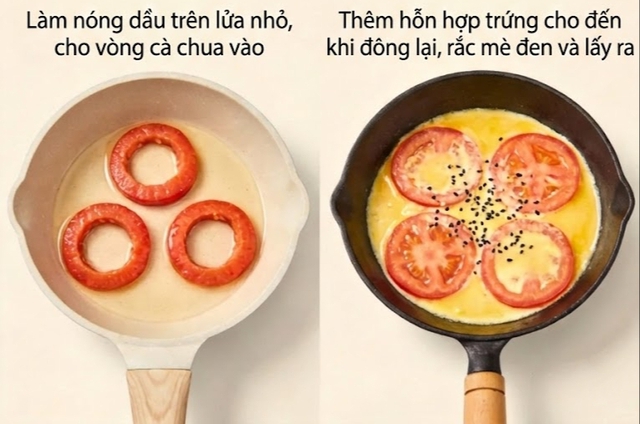 Làm nóng chảo với một lớp dầu thật mỏng, để lửa nhỏ. Xếp các khoanh cà chua vào chảo trước, sau đó nhẹ nhàng đổ hỗn hợp trứng vào giữa từng khoanh. Khi trứng bắt đầu se mặt, bạn có thể đậy nắp lại khoảng 1–2 phút để trứng chín kỹ bên trong mà không bị khô.