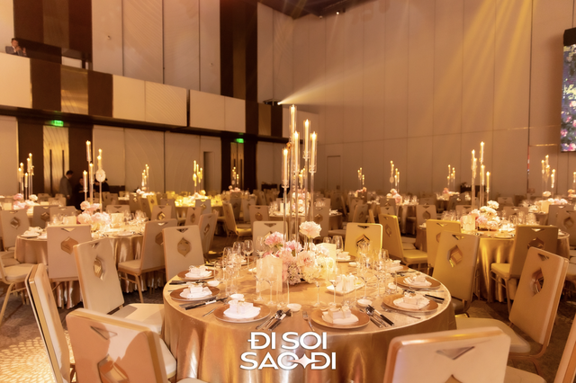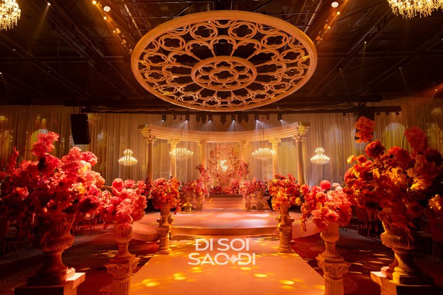 Sảnh tiệc được trang trí bằng hoa tươi với gam trắng – hồng – cam – đỏ, kết hợp ánh sáng vàng ấm, chất liệu kính – gương – pha lê, tạo hiệu ứng thị giác giống những bữa tiệc kiểu phục hưng châu Âu. Dresscode dạ hội dành cho khách mời càng khiến không gian đồng bộ và sang trọng hơn.