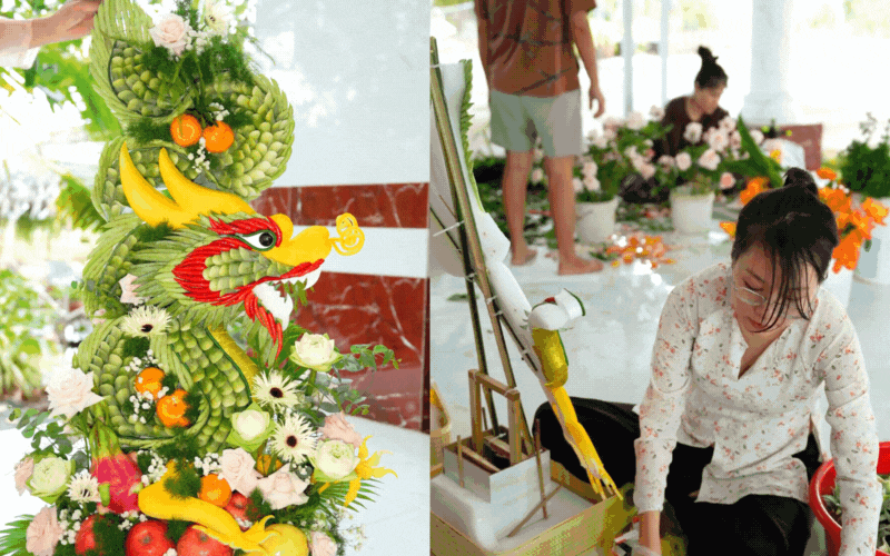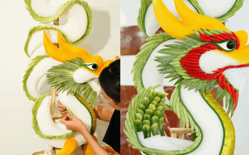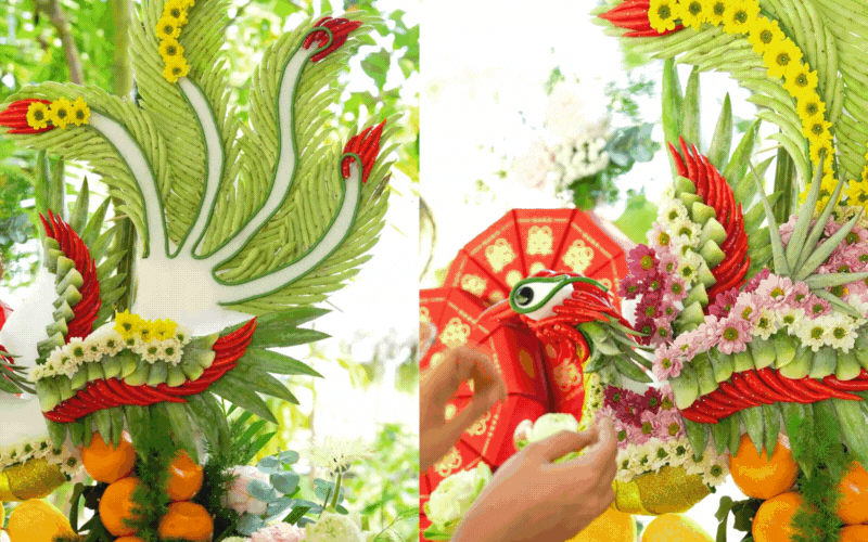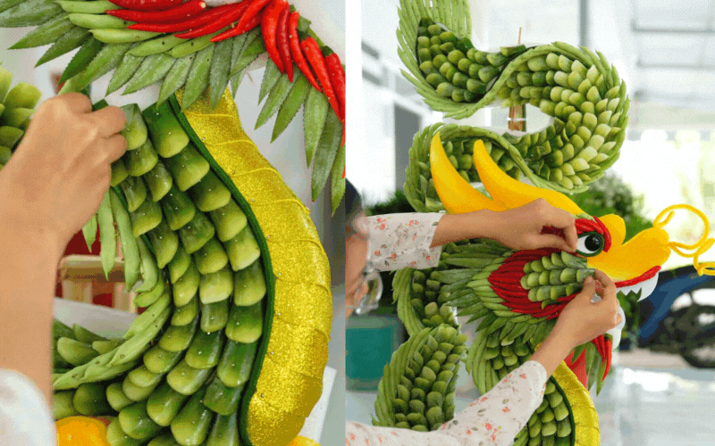 Hình rồng phượng uy nghi, sang trọng không kém gì đặt ngoài tiệm lớn thực chất được kết từ những lá dứa xin ngoài chợ về cắt nhỏ làm vảy, điểm xuyết thêm màu sắc từ đậu que và ớt đỏ tươi. Nhìn thành quả tráp rồng rực rỡ, sắc nét đến từng chi tiết, ít ai nghĩ đó là sản phẩm "handmade" từ rau củ quả trong vườn.