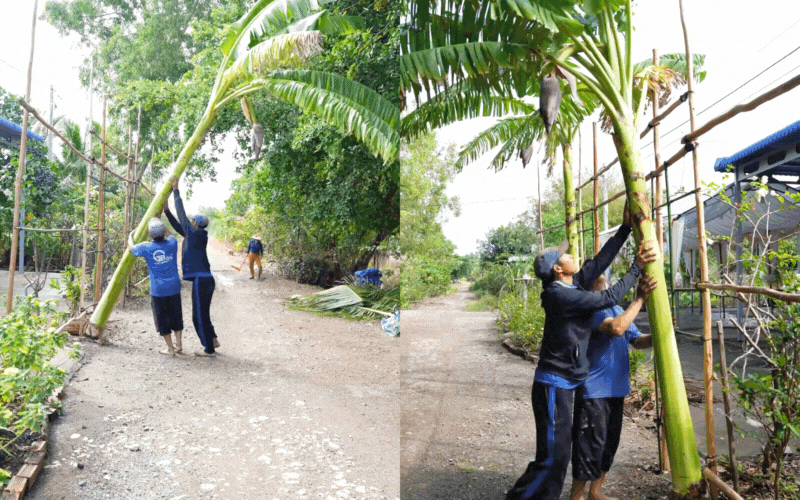 Không chỉ dừng lại ở mâm quả, không gian đám cưới của Út còn gây thương nhớ với chiếc cổng cưới đậm chất miền Tây sông nước, được dựng lên từ thân chuối và lá dừa. Sự mộc mạc và "chất" của chiếc cổng này nằm ở chỗ nó không được thiết kế sẵn bởi một nghệ nhân danh tiếng nào, mà là kết tinh của sự ngẫu hứng và tình làng nghĩa xóm.