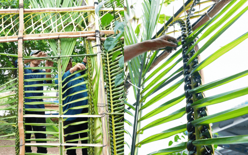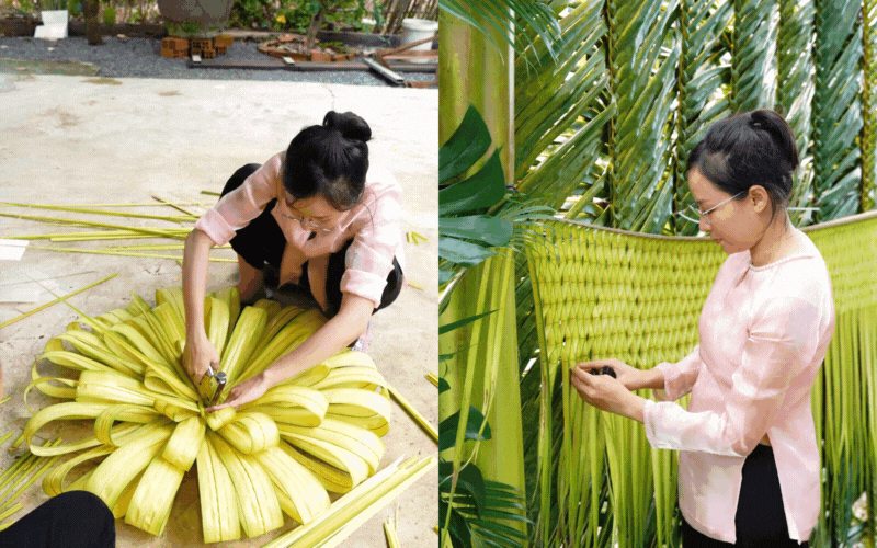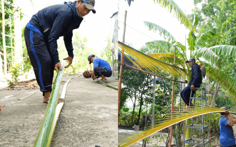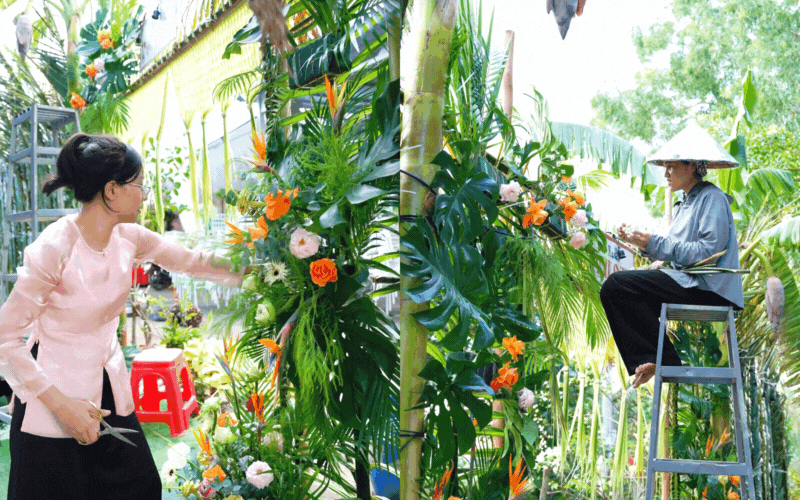 Câu chuyện đi tìm nguyên liệu của Út nghe sao mà dễ thương đến lạ: Anh trai cùng hàng xóm đi vòng quanh xóm để "săn" cho được 2 cây chuối có bắp đỏ đẹp về dựng khung; rồi hai anh em lại chạy xuồng đi xin vài bẹ dừa nước về trang trí. Đúng như Út hóm hỉnh chia sẻ: "Ở quê muốn gì cũng có, chịu khó đi xin là được". Dưới bàn tay tài hoa của anh Hai Út và anh Kha hàng xóm, những người giàu kinh nghiệm làm cổng dừa, cùng sự phụ giúp làm hoa trang trí của Út và các chị, các cháu, chiếc cổng dần hình thành.