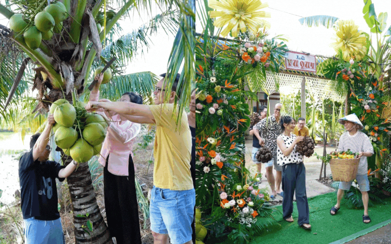 Không bản vẽ, làm tới đâu trang trí tới đó, thấy hợp mắt là được, thêm vài buồng dừa, sạp quả miệt vườn là hoàn thành. Chiếc cổng ấy hiện lên vừa dân dã, vừa ấm cúng, khiến bất cứ ai nhìn vào cũng thấy bồi hồi như được sống lại ký ức của những đám cưới làng quê ngày xưa, nơi mà mùi hương của lá dừa, cây rừng quyện lẫn với tiếng cười nói rộn ràng của bà con lối xóm.