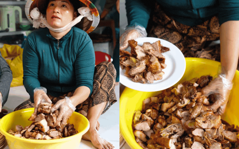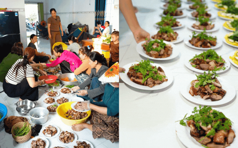 Những món ăn đậm đà hương vị miền Tây như vịt khìa nước dừa, mực né, chả nguội, canh vịt... đều được nấu bằng công thức gia truyền, bằng sự nêm nếm của tình thân. Dù vất vả, mồ hôi nhễ nhại, nhưng tiếng cười nói giòn tan chưa bao giờ ngớt. Chính cái không khí quây quần, người nhặt rau, người nhóm lửa ấy mới là thứ gia vị tuyệt vời nhất cho mâm cỗ cưới.