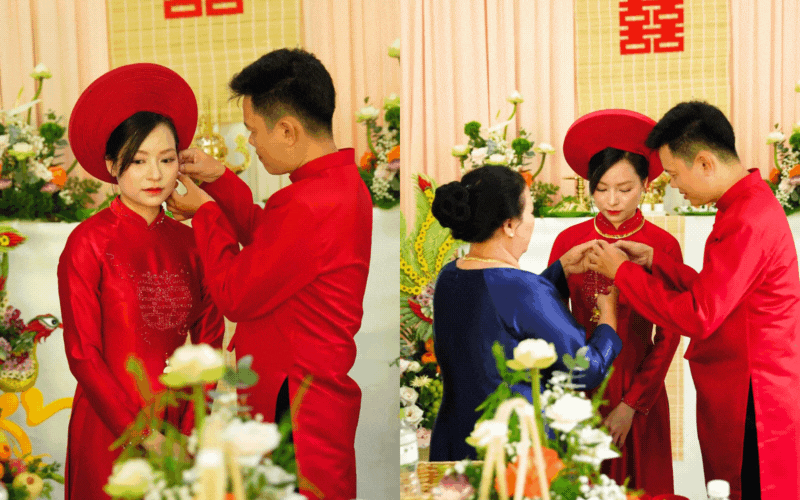 Và giữa khung cảnh bình dị ấy, Út xuất hiện rạng rỡ nhưng vẫn đầy dung dị. Cô dâu không diện váy cưới bồng bềnh hay đội vương miện lấp lánh, mà chọn cho mình tà áo dài đỏ truyền thống, đầu đội mấn, không đeo vàng vòng "rốp rẻng" hay trang điểm sắc sảo. Hình ảnh hai vợ chồng trao nhẫn cưới trước sự chứng kiến của gia đình hai bên, đơn sơ mà trang trọng, đã khép lại một đám cưới "đúng ý" của Út: Chân thật, ấm áp và đầy ắp yêu thương.