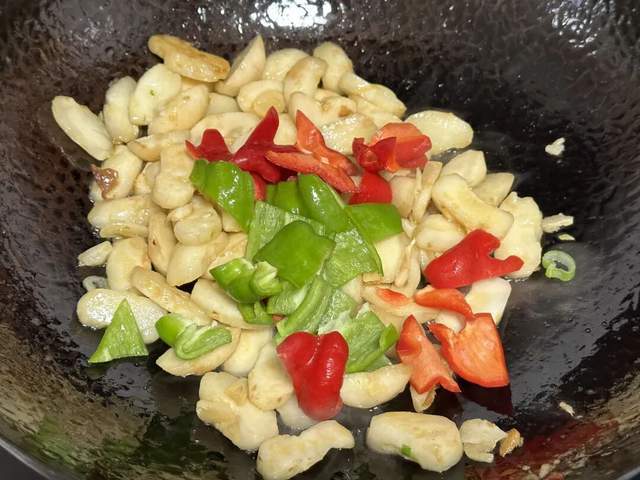 Bước 3: Tiếp theo thêm một ít dầu ăn vào chảo, phi thơm tỏi băm rồi cho củ năng vào xào đều. Sau đó, thêm một chút gia vị và 1 thìa canh nước tương vào rồi xào đều. Cho ớt chuông xanh và đỏ vào, không đảo, thêm một ít nước, đun nhỏ lửa khoảng 1 phút. Như vậy, ớt chuông sẽ không bị mềm mà vẫn giữ được độ giòn, đậm đà hơn. Nếu bạn không ăn thích ớt chuông thì có thể bỏ qua nguyên liệu này cũng được.