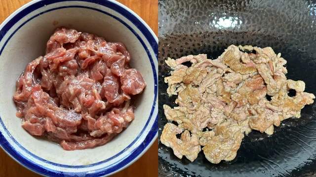 Bước 2: Thịt bò rửa sạch, dùng khăn bếp thấm khô nước rồi thái thành các lát mỏng. Cho thịt bò đã thái vào bát tô, thêm 1 thìa canh nước tương, 1 thìa canh dầu hào, một lượng bột tiêu trắng vừa đủ và 1 thìa canh bột bắp, trộn đều. Sau đó thêm chút dầu ăn, trộn đều, đậy kín và ướp khoảng 15 phút cho ngấm gia vị. Tiếp đó đun nóng chảo rồi cho một chút dầu ăn vào. Khi dầu nóng thì trút thịt bò đã ướp vào xào đến khi thịt đổi màu, lấy ra bát, để dùng sau.