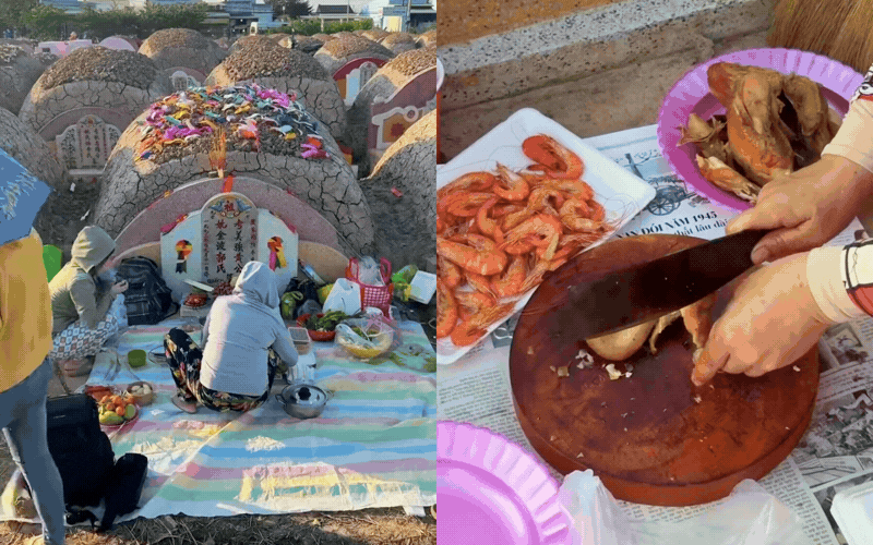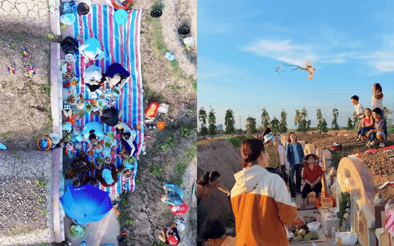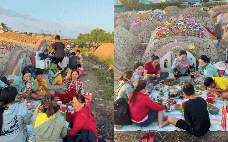 Khoảng sân lót gạch tàu hay tráng xi măng rộng rãi phía trước bia mộ không phải xây ra để bỏ trống. Đó là nơi diễn ra một trong những nét văn hóa đặc sắc nhất của người Hoa miền Tây dịp Thanh Minh: Cúng kiếng và ăn uống ngay tại mộ.