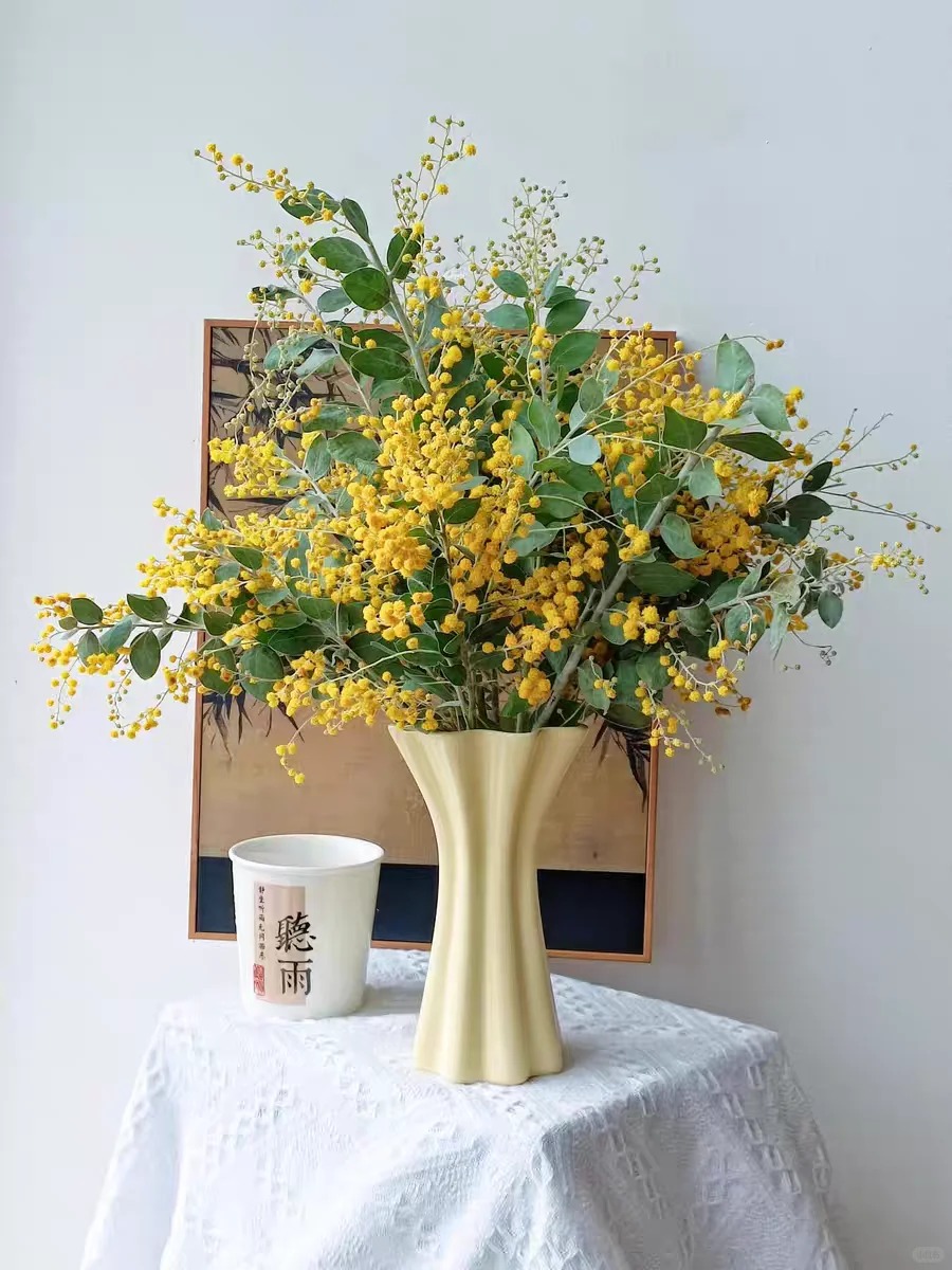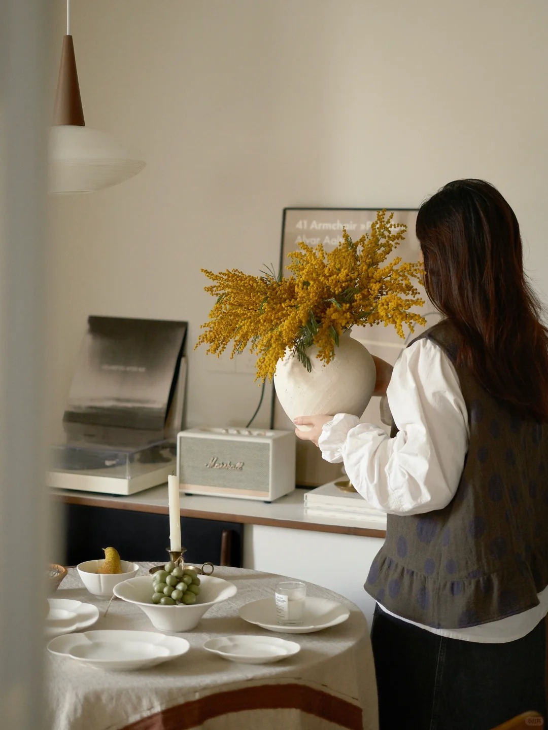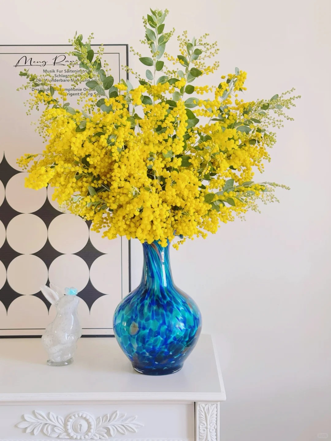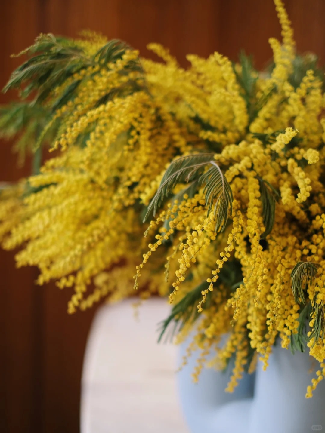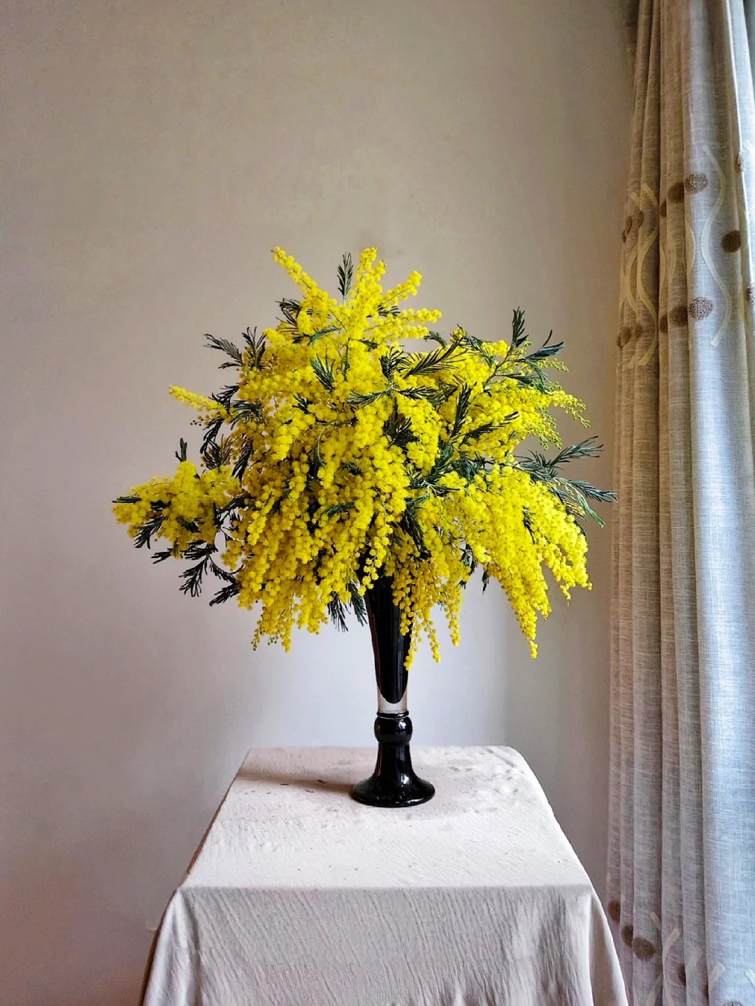 Bạn có thể cắm thả tự nhiên trong một chiếc bình gốm mộc mạc, hoặc cắm trong bình thủy tinh trong suốt để khoe trọn phần thân mảnh dẻ. Nếu muốn bàn tiệc Tết thêm phần sang trọng, hãy thử kết hợp mimosa với những bộ bát đĩa gốm sứ đồng màu hoặc khăn trải bàn linen màu be, màu kem.