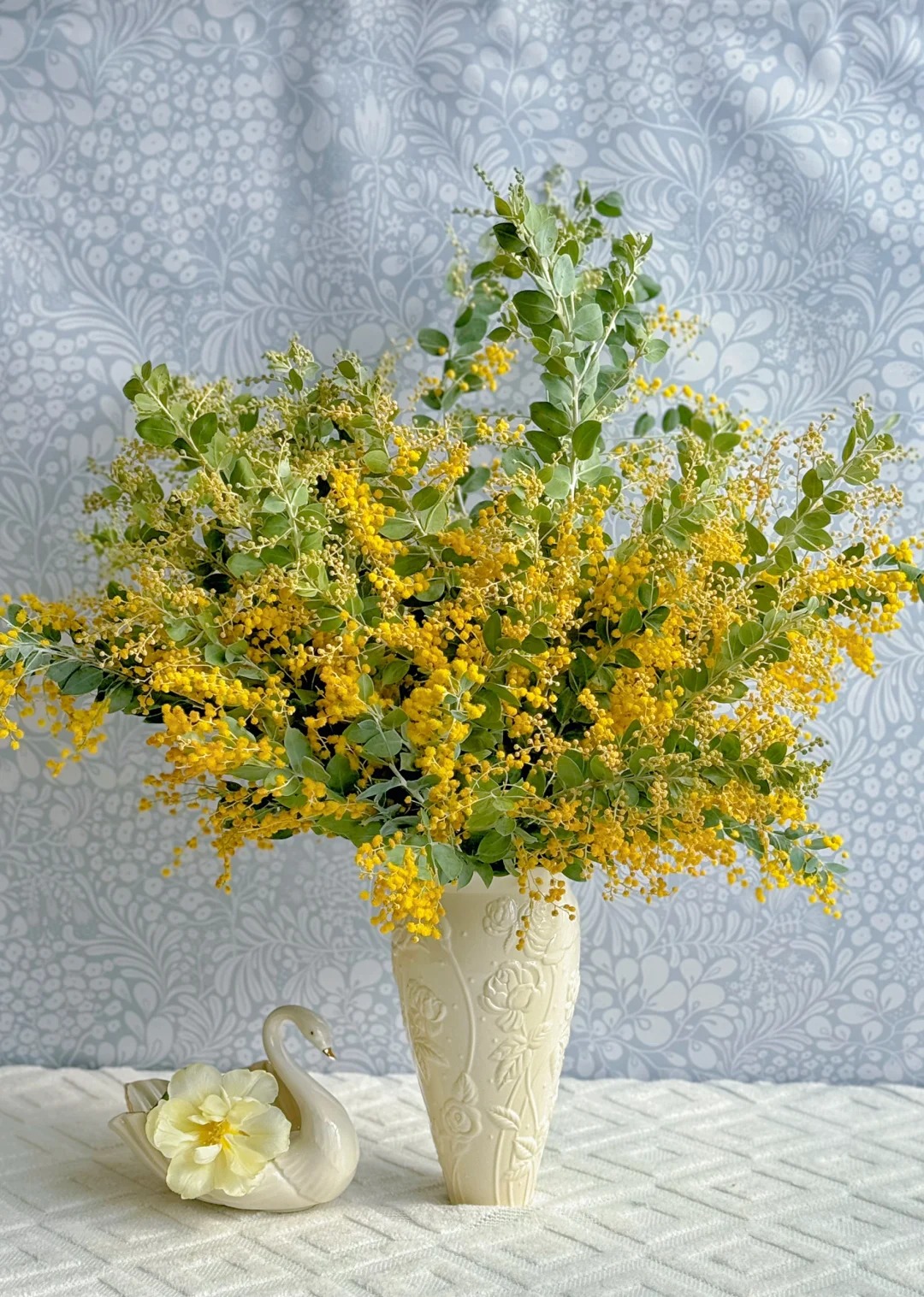 - Mix & Match: mimosa rất hợp khi cắm chung với tuyết mai (Spiraea), thanh liễu hoặc lá táo bạc (Eucalyptus).