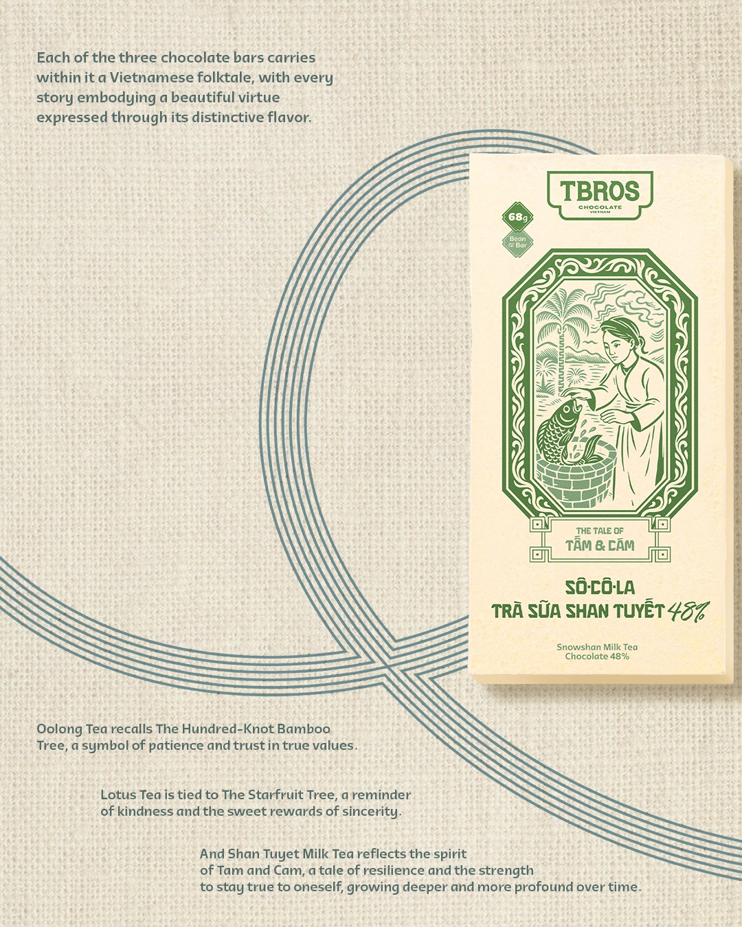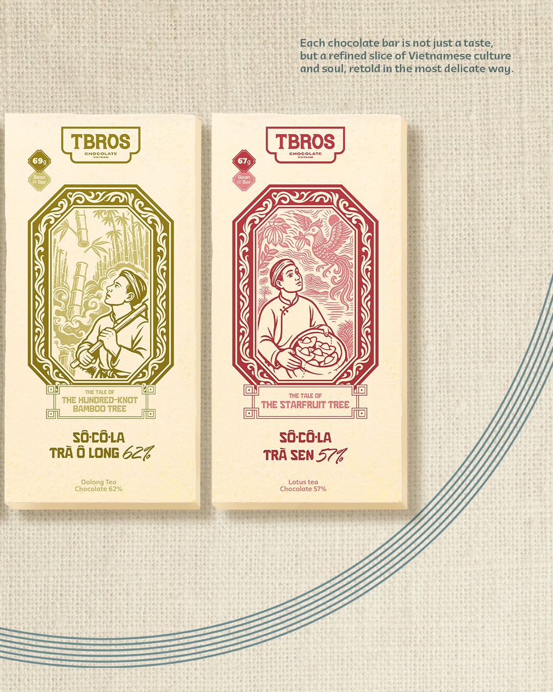 Một brand socola khác mà tôi cũng vô cùng yêu thích là TBROS, người sáng lập của thương hiệu này gọi đây là socola của niềm kiêu hãnh. Và quả thực, họ đã làm được, chúng ta có quyền kiêu hãnh về socola của Việt Nam. Socola của TBROS mang đậm dấu ấn bản địa từ vỏ đến ruột. Họ dùng giấy gói làm từ xơ dừa nước. Đặc biệt, trên thế giới chỉ ở mỗi Hội An mới có loại nguyên liệu sản xuất thứ giấy này.