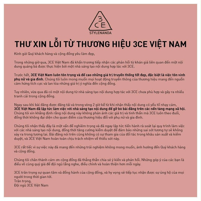 Trong thư xin lỗi, 3CE Việt Nam cho biết nội dung gây tranh cãi được thực hiện bởi một nhà sáng tạo nội dung hợp tác với thương hiệu. Thông tin này khiến không ít cư dân mạng cảm thấy lời xin lỗi dường như đang… chuyển hướng trách nhiệm.